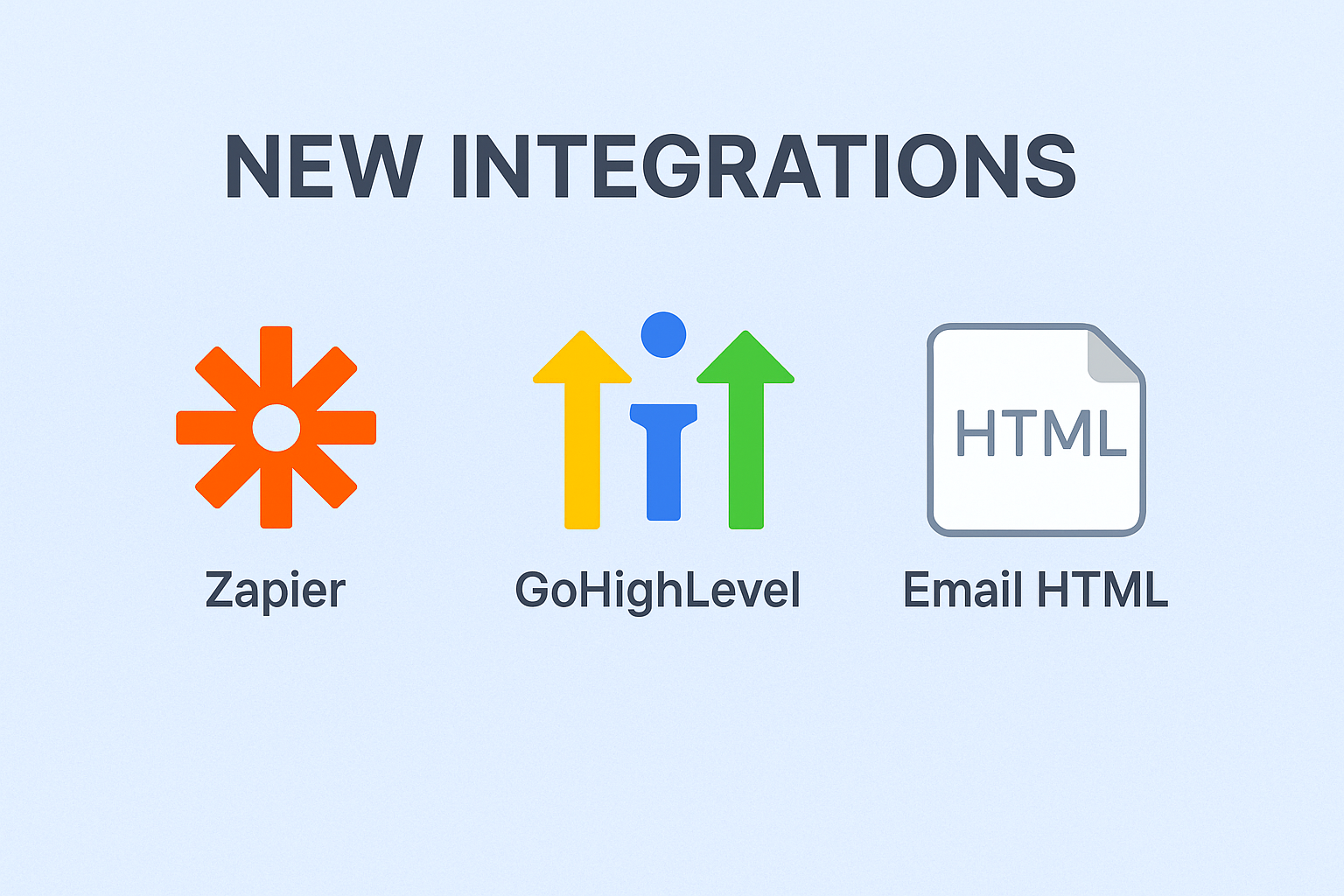 New Integrations: Zapier, GoHighLevel, Email HTML